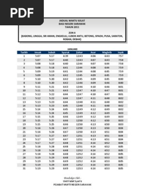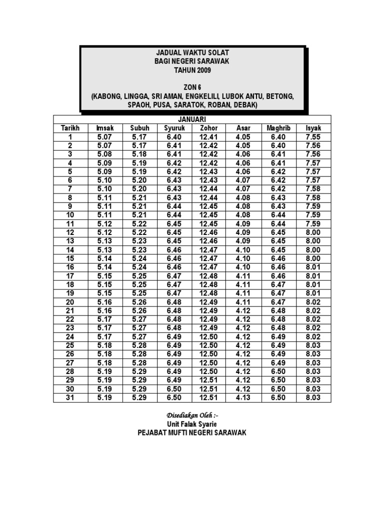 2020 Hak Cipta Terpelihara Jabatan Kemajuan Islam Malaysia. Jadual Waktu Solat Tahun 2021 Zon 6 KABONG LINGGA SRI AMAN ENGKILILI LUBOK ANTU BETONG SPAOH PUSA SARATOK ROBAN DEBAK Jadual Waktu Solat Tahun 2021 Zon 7 SAMARAHAN SIMUNJAN SERIAN SEBUYAU MALUDAM Jadual Waktu Solat Tahun 2021 Zon 8 KUCHING BAU LUNDU SEMATAN. Waktu Solat Subuh Sri Aman Subuh 0530 - Syuruk 0638 Waktu solat pagi 1 jam 8 minit.